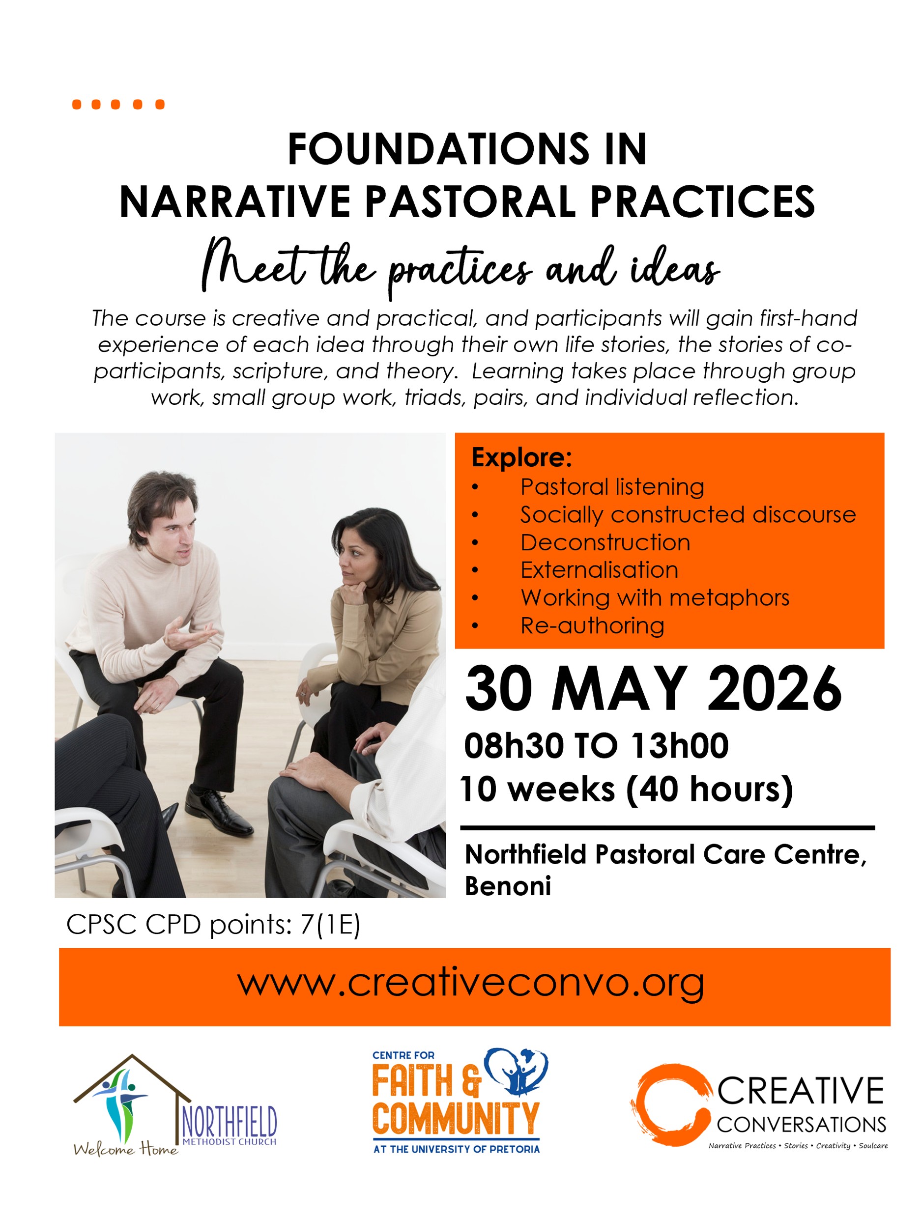 | 30 May 2026 | 8 (1 Ethics) | Foundations of Narrative Pastoral Practices Meet the Practices & Ideas | Dr. Nicole Dickson | Northfield Pastoral Care Centre, Benoni |