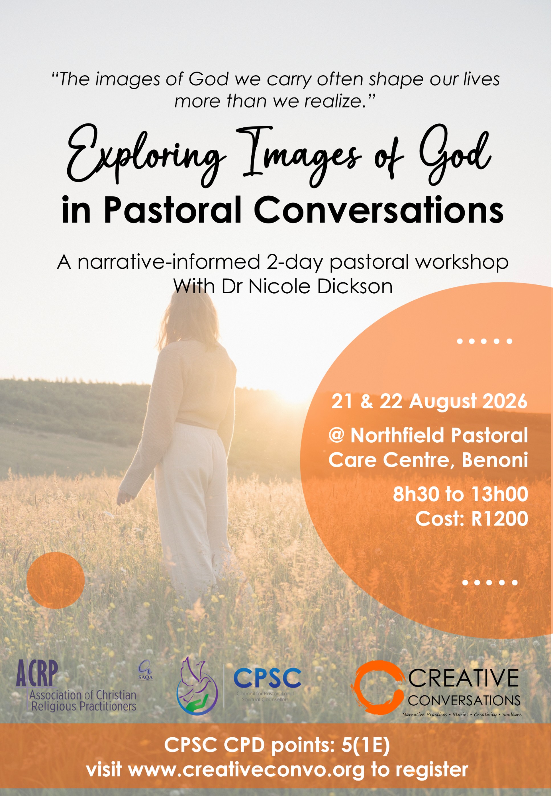 | 21 & 22 August 2026 | 5 (1 Ethics) | Exploring Images of God in Pastoral Conversations | Dr. Nicole Dickson | Northfield Pastoral Care Centre, Benoni |